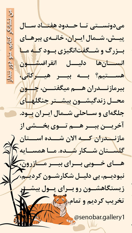 میدونستی تا حدود هفتاد سال پیش، شمال ایران، خانهی ببرهای بزرگ و شگفتانگیزی بود که ما انسانها دلیل انقراضشون هستیم؟چون برای تفریح شکارشون میکردیم و زیستگاهشون رو تخریب کردیم که برای خودمون زمین کشاورزی درست کنیم و به همین راحتی ببر هیرکانی رو از صفحه روزگار محو کردیم.