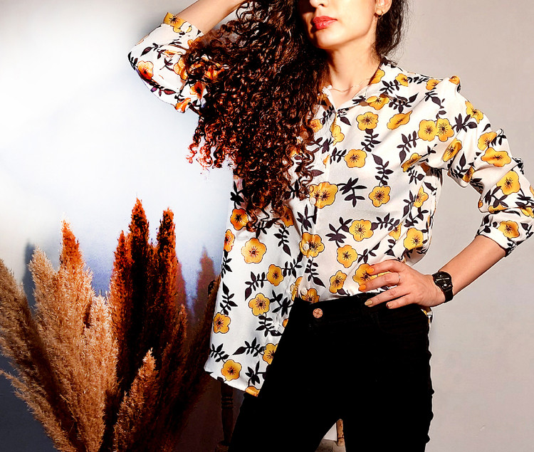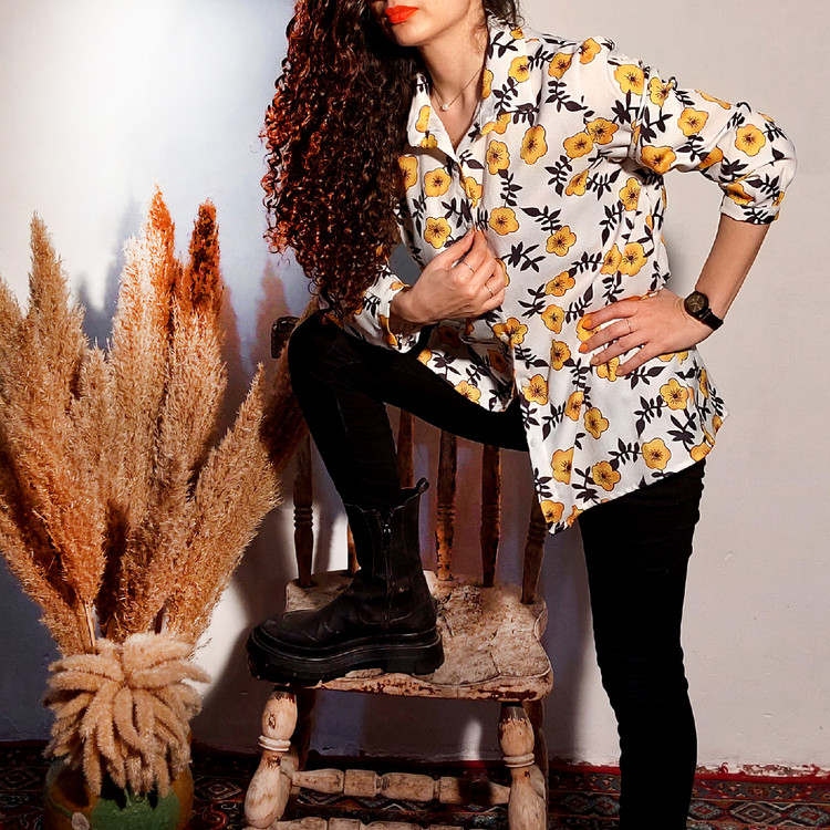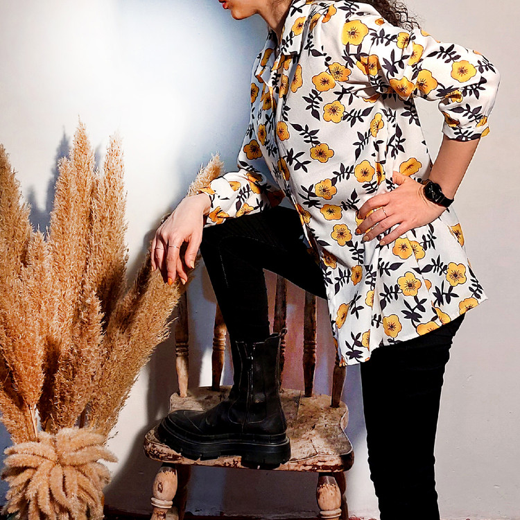 شومیز طرحدار کرپ فری سایز خنک و سبک (طرح گل زرد)