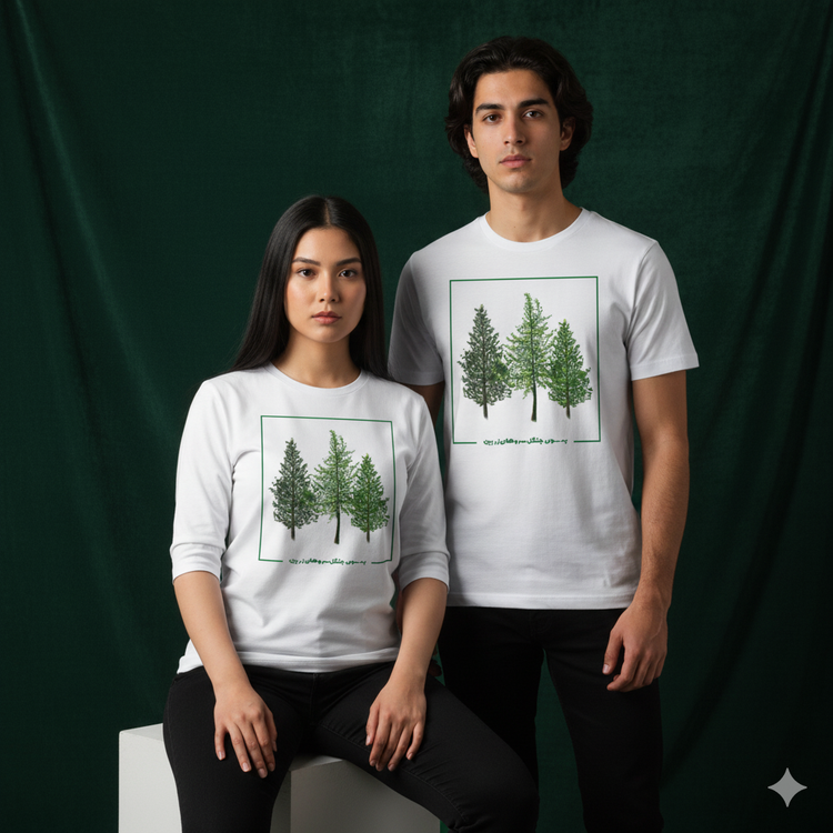 تی شرت نخ پنبه یونیسکس طرح به سوی سروهای زربین از کالکشن سرو زربین با نوشته فارسی